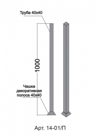 Столб для перил Арт. 14-01/П с декорированный стальной полосой 40 мм в виде перевёрнутой чаши на нижней части. Применяется при монтаже перил для межуровневых и входных лестниц, а так же балконных ограждений. Простота исполнения без декоративной художественной ковки делает этот столб одним из бюджетных вариантов.