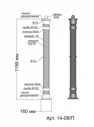 Кованый столб Арт. 14-06/П из витых квадратов применяется в качестве опорного элемента для лестничных и балконных перил. Вверху и внизу изделия декорованный стальными чашами, а навершие выполнено в виде сферы. Такой столб создаст неповторимый декор загородного дома и подчеркнёт индивидуальность владельца жилья.